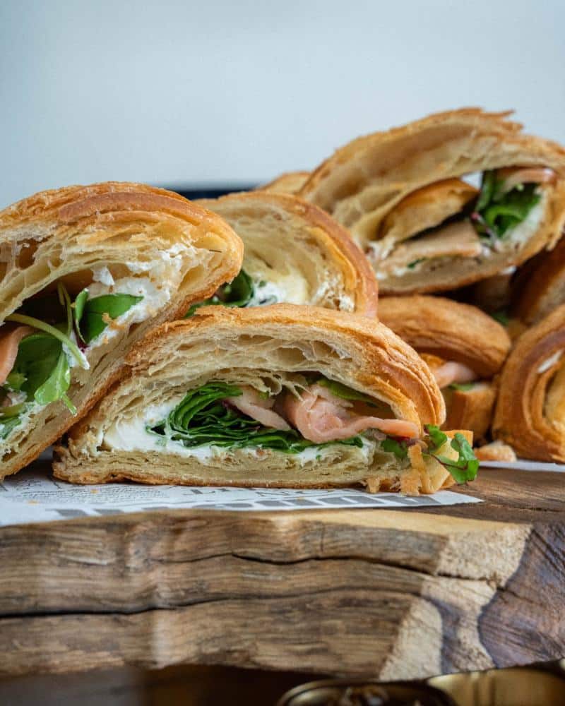 ממולא בגבינת שמנת, סלמון מעושן, פרוסות גאודה, פסטו ורוקט.